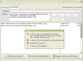 O Anti-Twin lista os resultados da busca usando um código de cores que facilita a identificação dos arquivos duplicados. O que fazer com os elementos repetidos? O programa permite enviar para a lixeira ou apagar os arquivos definitivamente do computador com todas as garantias.