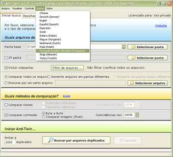 O funcionamento do Anti-Twin é simples. Selecione as pastas ou diretórios que quiser analisar e clique em “Search for duplicate files”. Caso seja necessário, afine a busca por filtros como nome, tamanho ou tipo de arquivos que o programa deve buscar.
